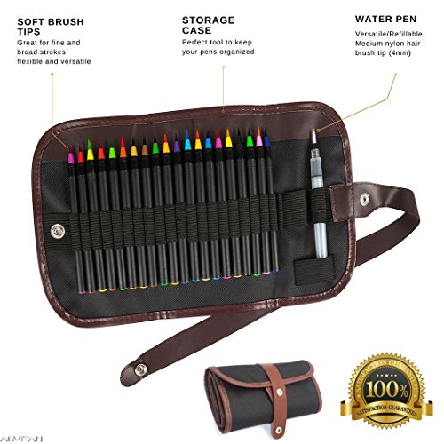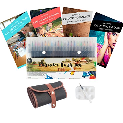- CREATE WITH OUR COLORFUL 20 PIECE SET: Our complete water brush pen pack gives you 20 vibrant colors, a paint mixing plate and a professional handmade wrap case to keep your watercolor art set neatly organized. Bonus water brush pen and eBooks with printer friendly coloring pages!