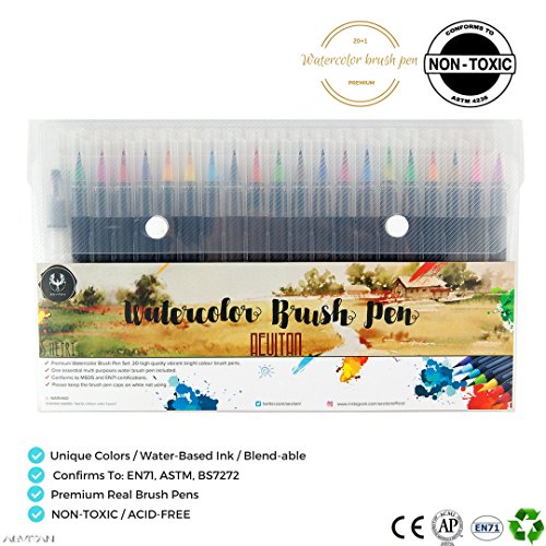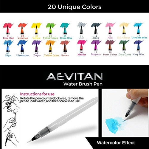 Water Color Brush Pens 20 Piece Set by Aevitan | Portable Water Brush Pen Set for Adults, Professionals and Kids | Flexible Brush Pen for Calligraphy, Painting, Sketching | 20 Bold Rainbow Colors