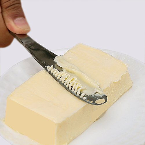 - USEFUL--Serrated side and edged side fit for cuts bread, butter, cheese, fruits, vegetables. Wider blade helps to collect the grated butter as well as provide more surface area for easy spreading, not only for spreading butter and jams but will work great on chocolate and hard cheeses