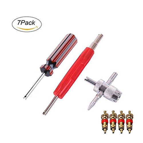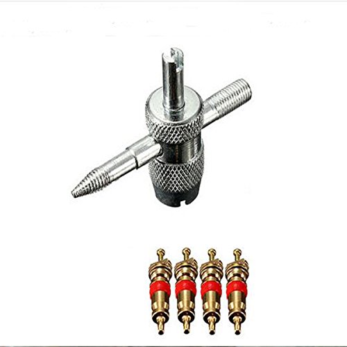 DSYCAR Tire Valve Repair Tool Set, Dual Single Head Valve Core Remover Tools & 4-Way Valve Tool & 4 Brass Valve Cores - Set of 7