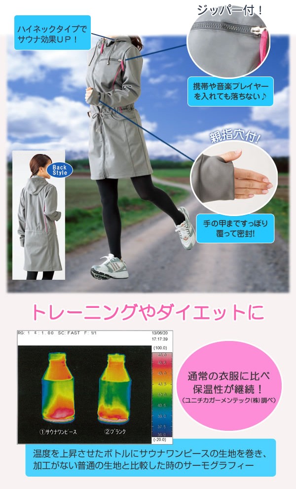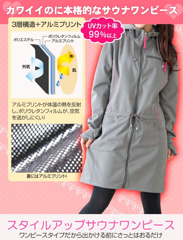 | <h1>かわいいのに本格的なサウナワンピース!三層構造+アルミプリントで体温を逃さず、空気を逃がさない。手の甲まですっぽり覆って密封!お出かけ時にさっとはおるだけで大量発汗!</h1> |