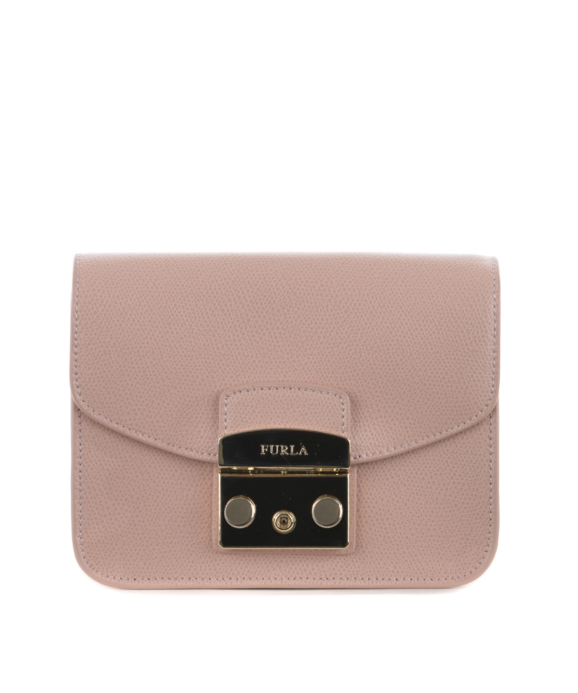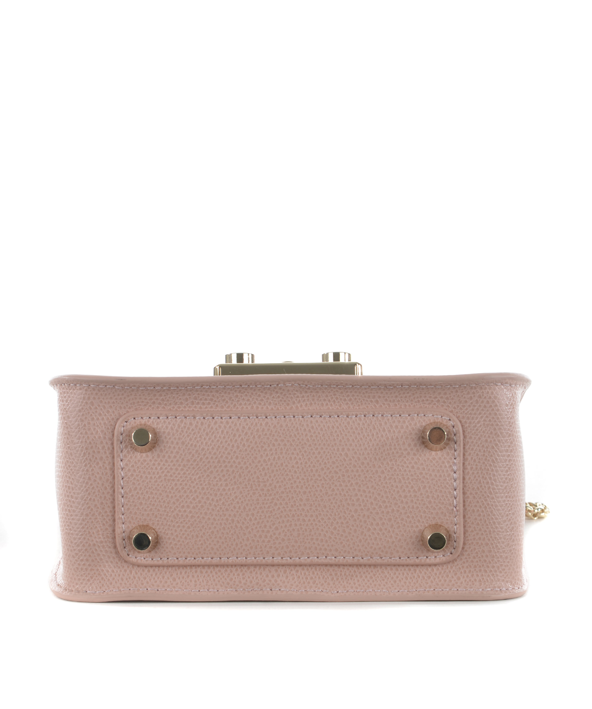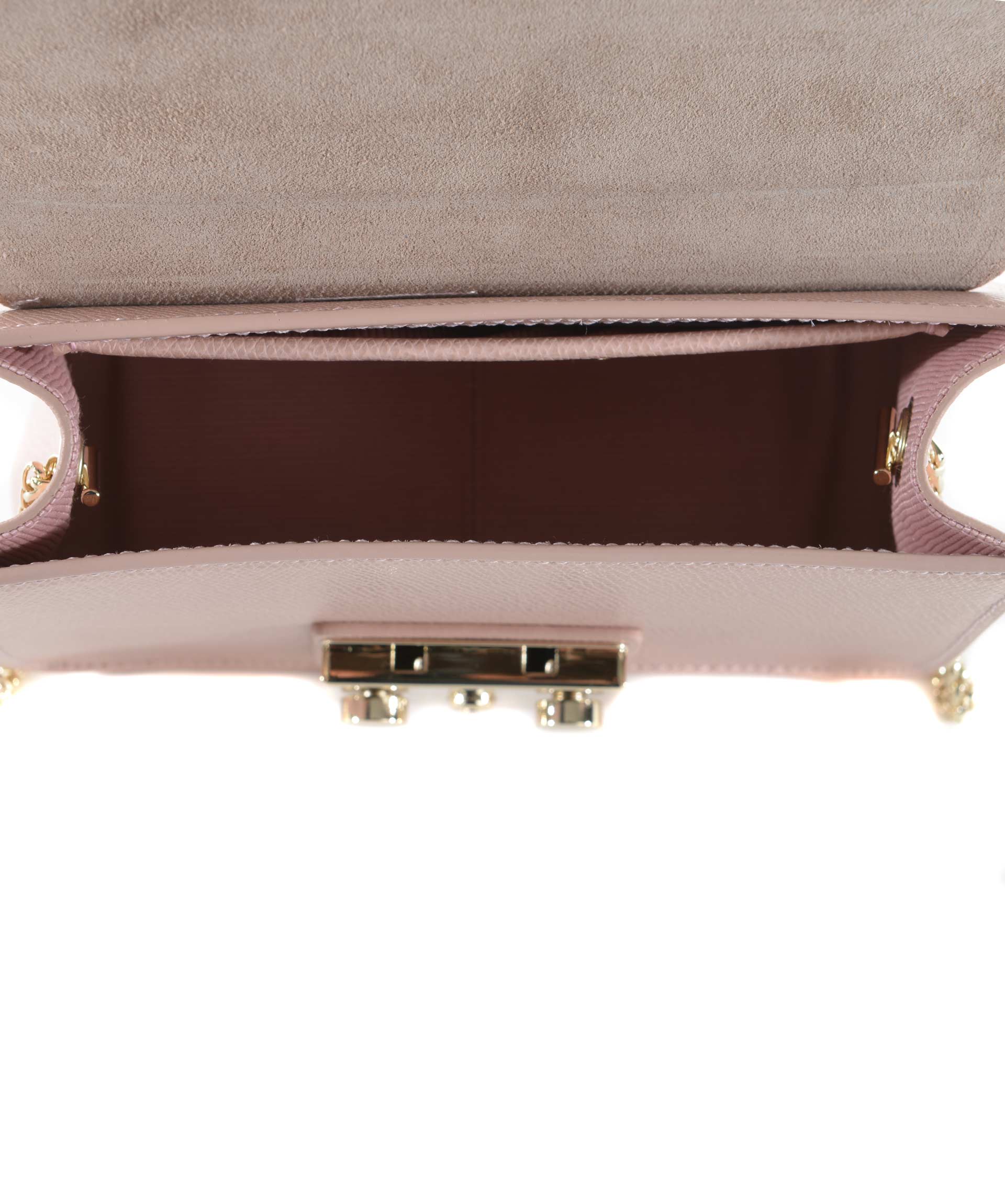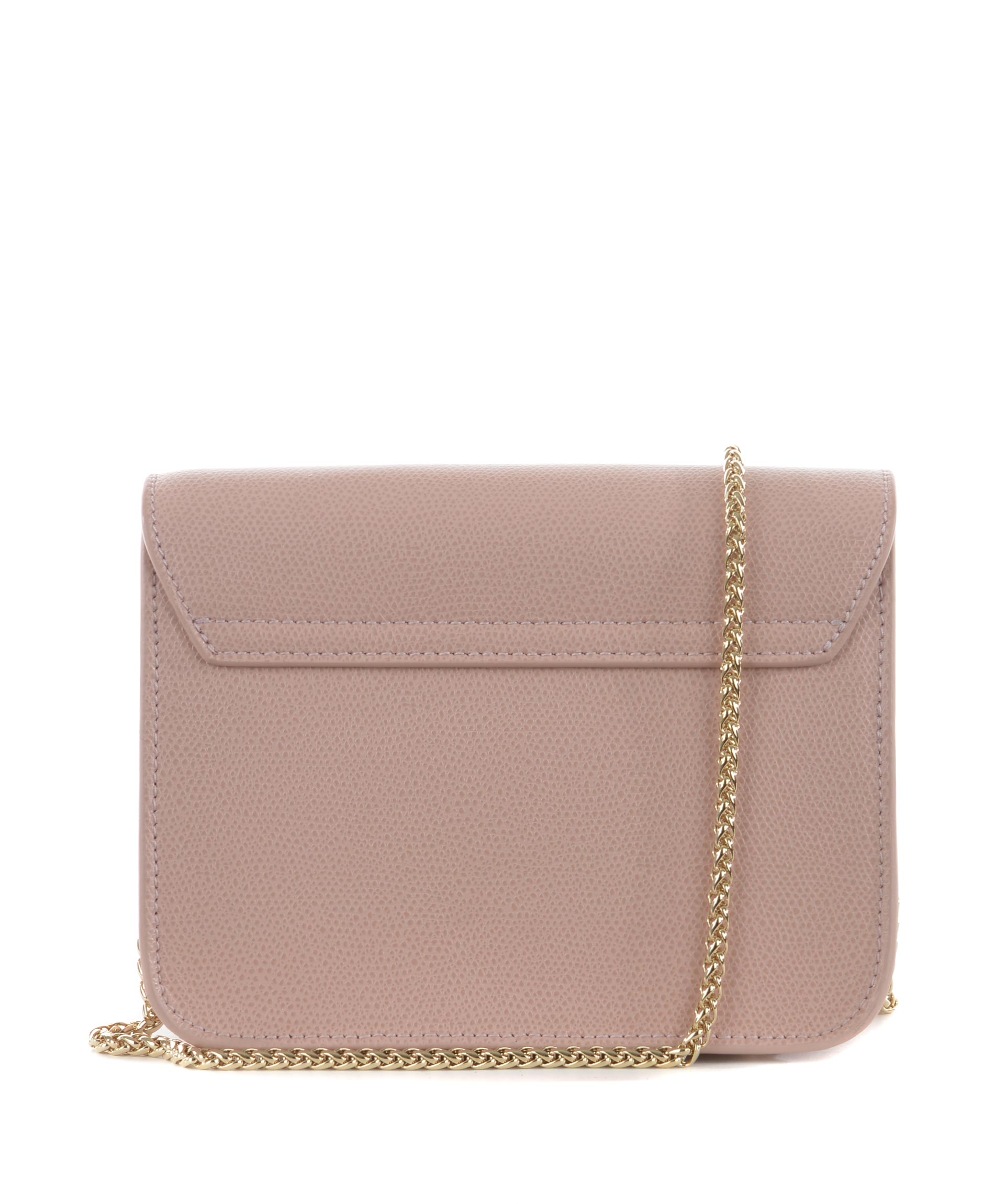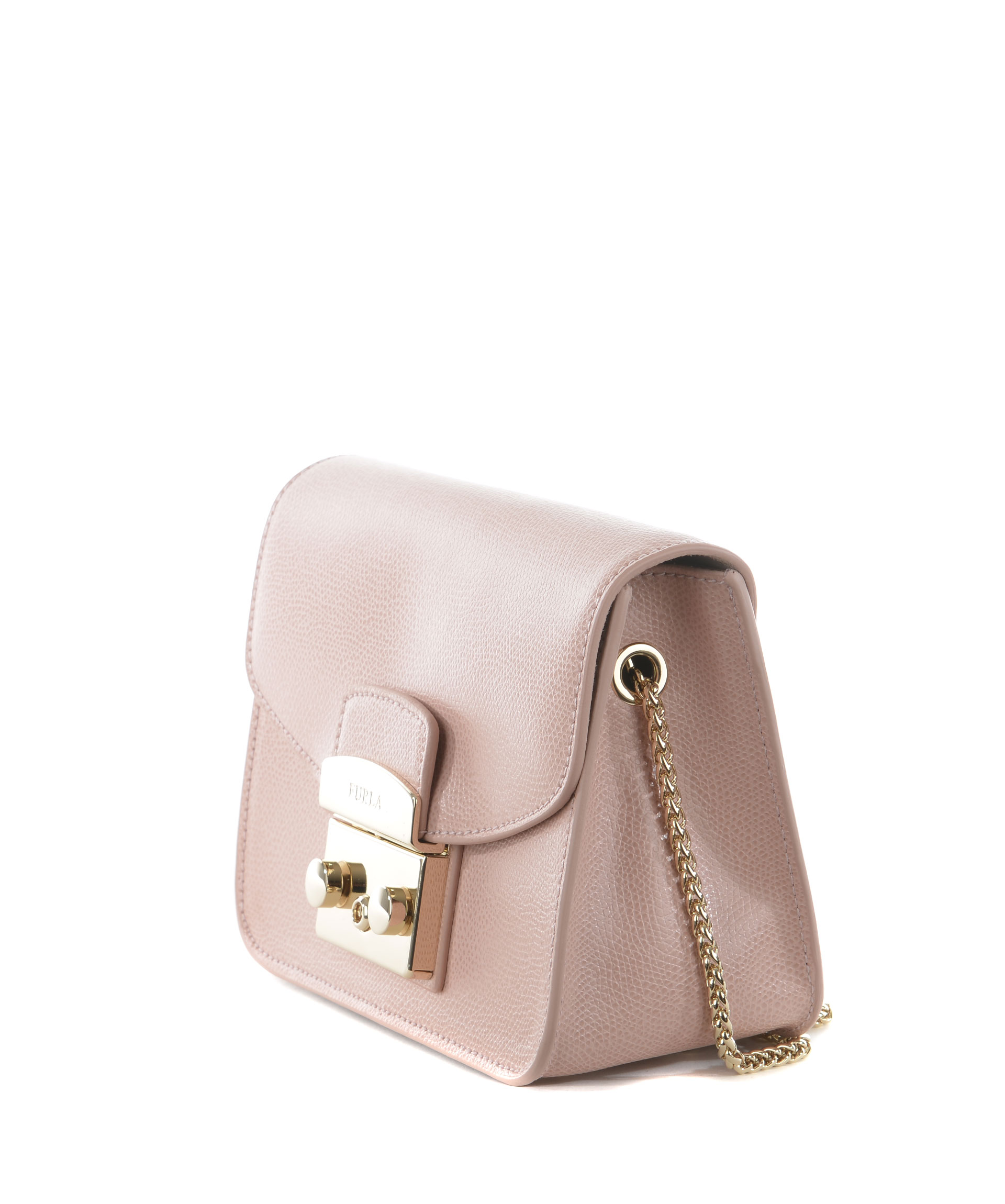 Tracolla Furla in pelle Rosa cipria. Tracolla a catena dorata. Patta frontale con apertura ad incastro. Tasca interna applicata. Foderata. Piedini metallici alla base. Placca logo frontale in metallo dorato.