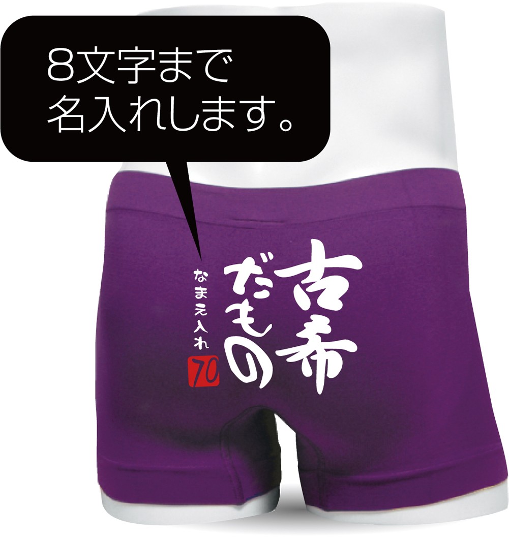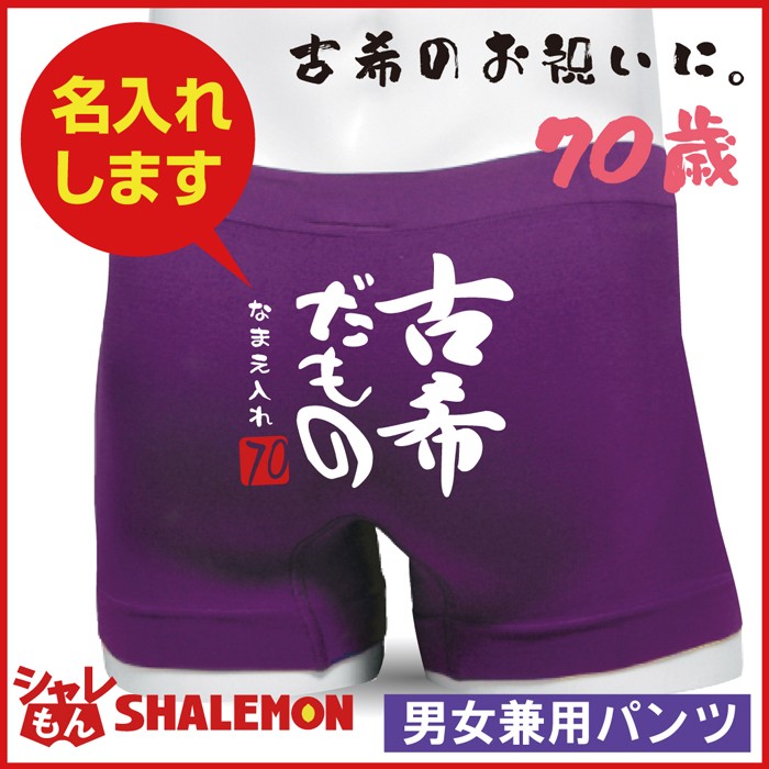 70歳のお誕生日プレゼントに、「古希だもの」シリーズが人気です。古希のお祝いに実用性抜群のインナーパンツを父・母・おじいちゃん・おばあちゃん、ご両親にプレゼントしませんか?当店“シャレもん”のボクサーパンツは伸縮性の高いナイロン素材を使用し男女共に着用できます。おなまえの部分に8文字まで名入れできます。※文字は白色です。ひらがなでの名入れがお勧め!漢字での名入れは明朝体になりますので、ご了承ください。きっと笑顔になる素敵なプレゼントです。
