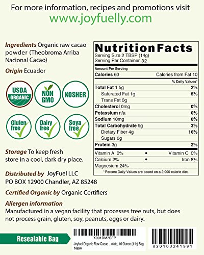 Joyfuel Organic Raw Cacao Powder, Rich Dark Chocolate, 16 Ounce (1 lb) Bag