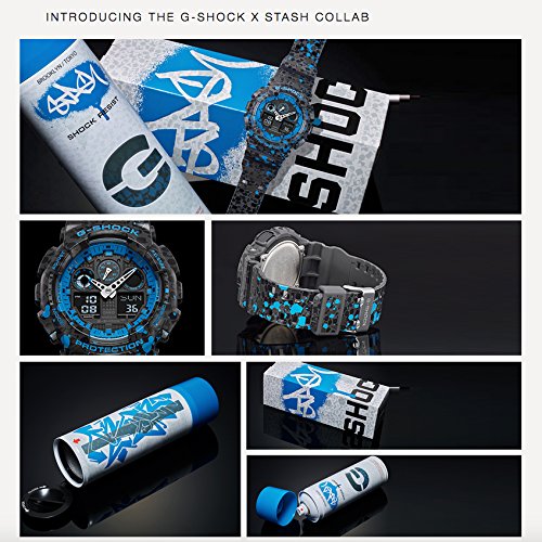 G-Shock and legendary New York street artist Stash collaborated together to create a very unique limited edition. The limited edition model boasts a black on black print of aerosol caps on the band and case over which a blue splash pattern was applied, designed exclusively for G-SHOCK by STASH. The GA100ST-2A will also come with a one-of-a-kind spray can packaging featuring STASHs unique logo.Feature