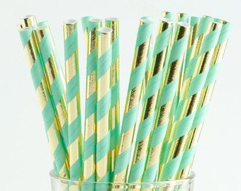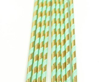 Mint and Foil Gold Stripes High Class Paper Straws Parties, Weddings, Baby Showers & More: Gold Star Straws - Disposable & Eco- Friendly, 100% Biodegradable Unique & Elegant Designs (set of 75)