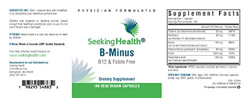 -. Binding : Health and Beauty -. Brand : Seeking Health -. EAN : 0798295548832 -. Feature : IMPORTANT: B-Minus is manufactured for and sold exclusively by Seeking Health. We DO NOT recommend purchasing this product from any supplier other than Seeking Health on Amazon.com. / Provides Thiamin, Riboflavin, Niacin, Vitamin B6, Pantothenic Acid, Biotin. / Free of Vitamin B12 and Folate. / Non-GMO. / Physician Formulated -. Label : Seeking Health -. Manufacturer : Seeking Health -. MPN : BMINUS-100-CAPS -. PartNumber : BMINUS-100-CAPS -. ProductGroup : Health and Beauty -. ProductTypeName : HEALTH_PERSONAL_CARE -. Publisher : Seeking Health -. Studio : Seeking Health -. Title : B-Minus | Provides Thiamin, Riboflavin, Niacin, Vitamin B6, Pantothenic Acid, Biotin | Free of B12 and Folate | Non-GMO | Physician Formulated | 100 Vegetarian Capsules |Seeking Health -. UPC : 798295548832