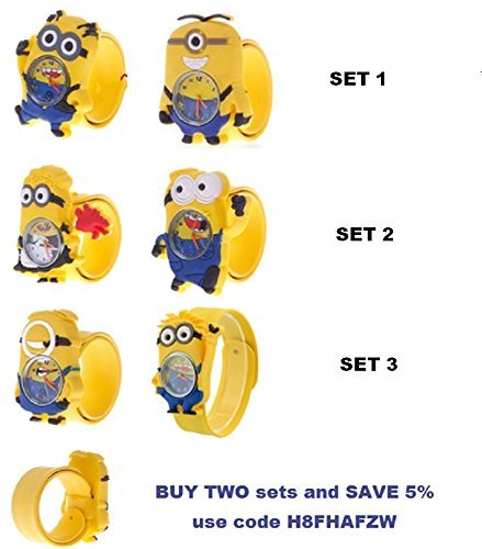 -. Brand : FAJ -. Department : unisex-child -. Feature : HIGH QUALITY ★ Comfortable to wear, this Despicable Me's Minion Children's Watch is designed for comfort and functionality. This watch is shock absorbent to add to it's durable design. / EDUCATIONAL TOY ★ Let Kevin, Stuart, Herb, and Bob makes learning to tell time easy and fun. / CONVENIENT SLAP BAND ★ Incredibly easy to put on and take off for just about any age. Simply "slap" it on your wrist and watch the band encircle your wrist. Simply adjust for comfort and VOILA!!! Your very own Minion companion! / SET OF TWO ★ Each set comes with two, individual watches to help keep your child continuously entertained while learning how to tell time. Additionally, the band is removable to allow the Minion time piece to act as a pocket watch. / WONDERFUL HOLIDAY GIFT ★ Christmas, Hanukkah, Birthday and all occasion gift -. PackageQuantity : 2 -. ProductGroup : Apparel -. ProductTypeName : CHILDRENS_COSTUME -. Size : 27.5 X 27.5 -. Title : Kids Despicable Me, Minion, Slap Watch, Girls, Boys Educational -Time Teacher