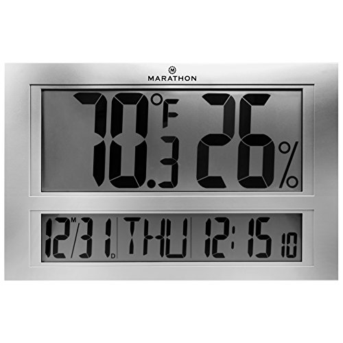 -. Brand : Marathon -. Color : Silver -. EAN : 0063442320631 -. Feature : JUMBO HYGROMETER - Full temperature and humidity display with time, day and date / MULTIPLE DISPLAY MODES - 12 or 24 Hour display formats with indoor temperature display in celsius or fahrenheit / MULTIPLE LANGUAGES - The day of the week can be displayed in 4 languages (English, German, French, Spanish) / BATTERIES INCLUDED - 3 C long life batteries included -. IsAutographed : 0 -. Label : Marathon Watch Company -. Manufacturer : Marathon Watch Company -. MPN : CL030040 -. NumberOfItems : 1 -. PackageQuantity : 1 -. PartNumber : CL030040 -. ProductGroup : Lawn & Patio -. ProductTypeName : OUTDOOR_LIVING -. Publisher : Marathon Watch Company -. Studio : Marathon Watch Company -. Title : MARATHON CL030040 Jumbo Indoor Digital Thermometer Hygrometer Humidity Monitor with Clock and Calendar - Batteries Included -. UPC : 063442320631 -. Warranty : 1 year warranty