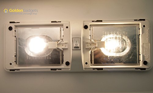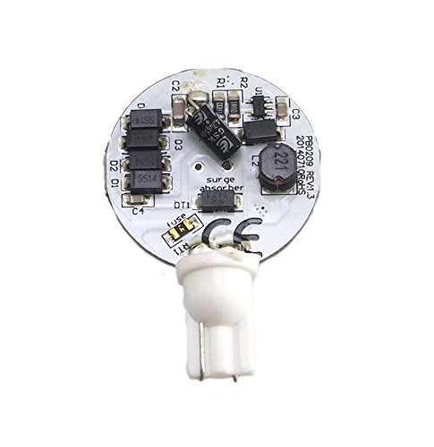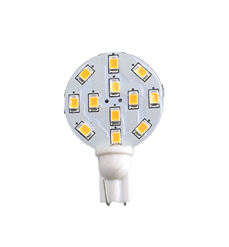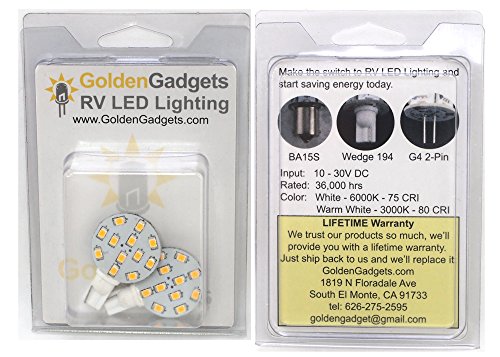 Brand:Golden Gadgets Part Number:RV-T10-12LED-SIDE-WARM-2PAK Item Weight:0.8 ounces Product Dimensions:1.8 x 1.2 x 0.5 inches Item model number:RV-T10-12LED-SIDE-WARM-2PAK Assembled Height:0.45 inches Assembled Length:1.8 inches Assembled Width:1.2 inches Color:warm white Shape:Circular Voltage:12 volts Specific Uses:Indoor use only Fixture Features:Instant On and Shock Resistant, Uses only 2 Watts of power vs 25 Watt Incandescent, Disc Shaped for fitment in flat fixtures, 12V or 24V DC Regulated for 10V to 30V DC, Lifetime Warranty Type of Bulb:LED Luminous Flux:200 lm Wattage:2 watts Incandescent equivalent:25 watts Bulb Features:Instant On Color Temperature:3000 Kelvin Color Rendering Index (CRI):80.00 Bulb Diameter:1.2 inches Bulb Length:1.8 inches Shipping Weight:3.2 ounces (View shipping rates and policies)