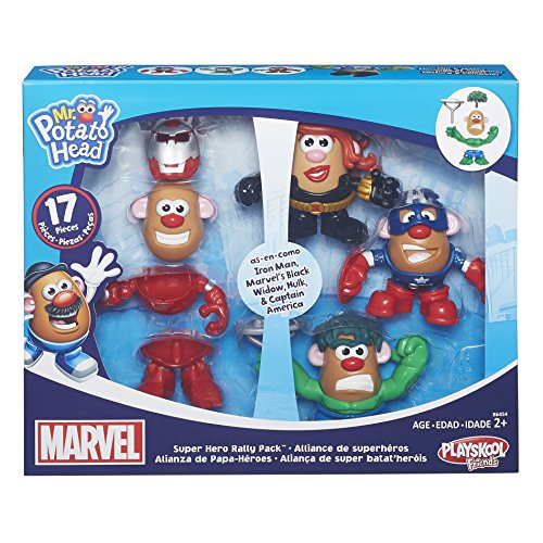 Little ones can imagine lots of adventures with these Mr. Potato Head figures mashed up with Marvel Super Heroes! Kids can style these spuds like some of their favorite Marvel Super Heroes with pieces inspired by Marvel's Black Widow, Hulk, Captain America and Iron Man characters. Sized for little hands, the set includes 2" potato bodies, character headpieces, torsos and bases, plus a potato masher accessory. Kids can also mix up the pieces to create their own super spud characters. Most parts are compatible with other Mr. Potato Head and Mrs. Potato Head toys (each sold separately). Marvel products are produced by Hasbro under license from Marvel Characters B.V. Mr. Potato Head and all related characters are trademarks of Hasbro.Feature