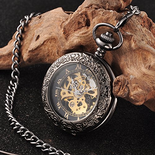 JPC 회중 시계 포켓 워치 기계식 태엽 양면 스켈리턴 문자판 골드 로마숫자 앤틱풍 체인 첨부 와 목걸이 펜던트 기프트 상부속 선물용