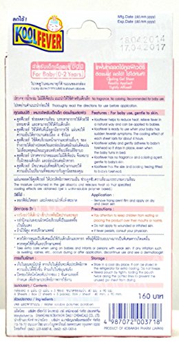 - Feature : Can be readily used when your child has feverish symtoms / Helps to reduce heat relieve fever in a natural way and can be applied to babies / Size : 6 sheets ( size of 40 mm x 90 mm ) Per Box / Safely and gently adheres to babys forehead so it stays in place even when the baby turns in bed / Dispatched From Thailand.Sold By Go Greens