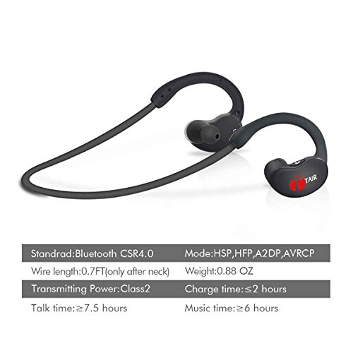 -. Binding : Wireless Phone Accessory -. Brand : TAIR -. Label : TAIR -. Manufacturer : TAIR -. PackageQuantity : 1 -. ProductGroup : Wireless -. ProductTypeName : WIRELESS_ACCESSORY -. Publisher : TAIR -. Studio : TAIR -. Title : TAIR Bluetooth Stereo Headphone,Wireless Sports Headset With Microphone,In-Ear Earbuds,Cool Black