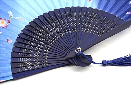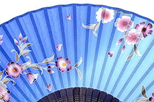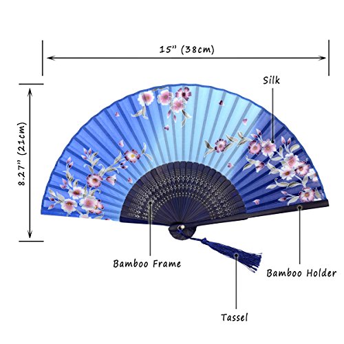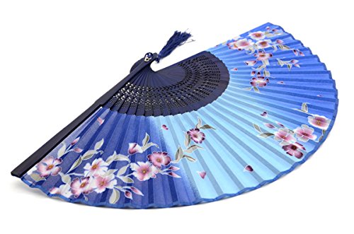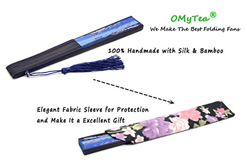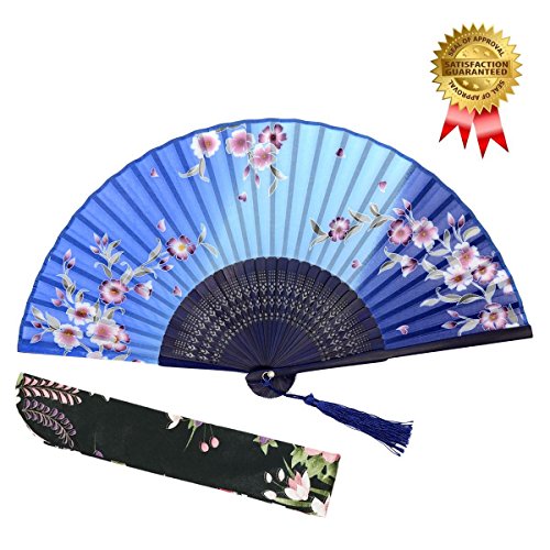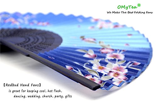 OMyTea "Redbud" Chinese / Japanese Folding Hand Held Fan for Women - With a Fabric Sleeve for Protection - for Wedding, Dancing, Church, Party, Gifts (Blue)