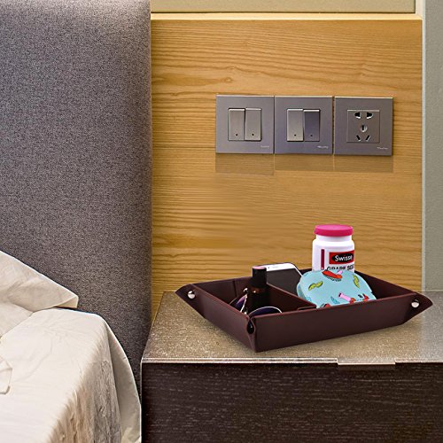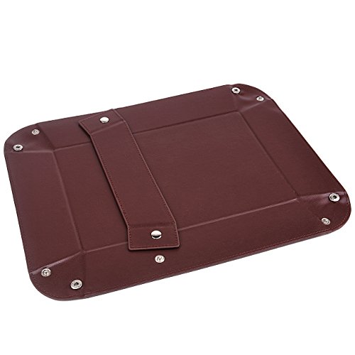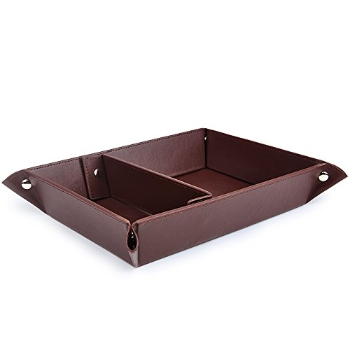 -. Feature : Large Valet Tray-Made of PU leather with velvet,lightweight and easy to clean. / Multi-Purpose-2 compartments and can store your EDCs,such as cell phone, watch, key, jewelry and change. / Multi-Colors Choice-This jewelry organizer with 3 colors to choose from,classic black, elegent coffee and retro winered. / Easy to Use-Reinforced with rivets on the corners easy to open and close. / Open Size-L:32cm/12.6 Inches W:25cm 9.84 Inches.