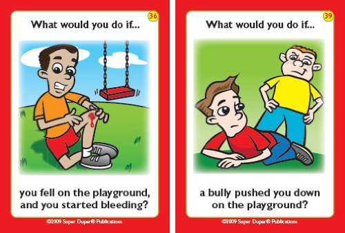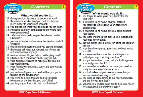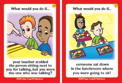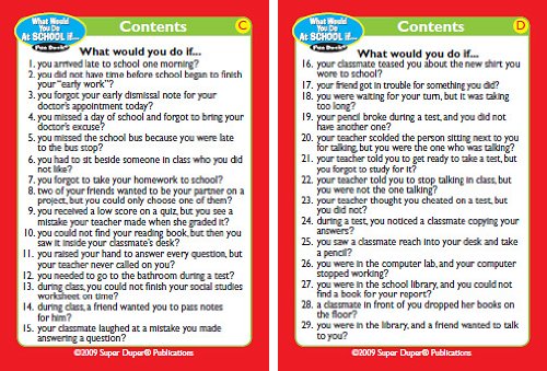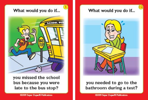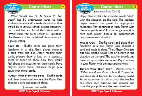 Help your children make good choices in and around school with Super Duper's What Would You Do At School if... Fun Deck. Children learn how to solve problems, understand cause/effect relationships, and practice good social skills. 56 total cards with game ideas. Sturdy tin. 2 1/2" x 3 1/2".