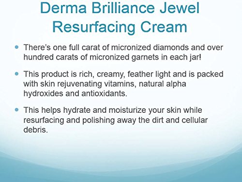 -. Feature : Derma Brilliance - THE AT HOME COSMETIC SKIN RESURFACING SYSTEM. IT COMBINES A REVOLUTIONARY RANDOM ORBIT SKIN CARE DEVICE, WITH A DIAMOND AND GARNETT INFUSED RESURFACING CREAM THAT ACTUALLY HELPS POLISH AWAY THE VISIBLE SIGNS OF AGING. / Derma Brilliance Jewel Resurfacing Cream - There's one full carat of micronized diamonds and over hundred carats of micronized garnets in each jar! This product is rich, creamy, feather light and is packed with skin rejuvenating vitamins, natural alpha hydroxides and antioxidants. This helps hydrate and moisturize your skin while resurfacing and polishing away the dirt and cellular debris. / CAN GET REAL RESULTS BY POLISHING AWAY THE CELLULAR DEBRIS AND BRINGING NEW, FRESH SKIN TO THE SURFACE. Used for cleansing and moisturizing. Perfect for all skin types. Lightweight, easy to use and waterproof. / Gentle for every day cleansing. Includes 3 treatment heads. A high and a low side. A button with a 2 minute timer and no-timer option.