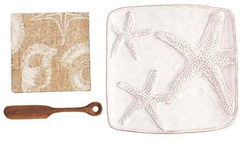 Product Description3-piece set. Milk glazed terracotta cheese plate features raised starfish design and arrives with 12 cello-wrapped shell napkins and wood spreader.0