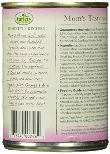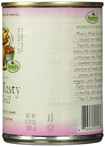 Mom's Tasty Mixed Grill has delicious beef in vegetable broth, with moist turkey, chicken & tender slow-cooked potatoes. Mom's Mixed Grill was always the family favorite. Now you can share the same experience with your dog. Recipe No.4 contains the perfect portion of assorted meats, whole grains and delicious veggies plus Omega 3 & 6 Fatty Acids to promote a healthy skin and coat. They'll love every bite!.Feature