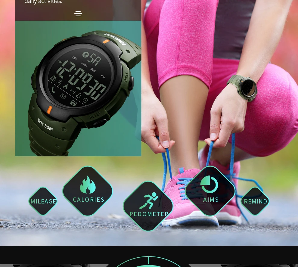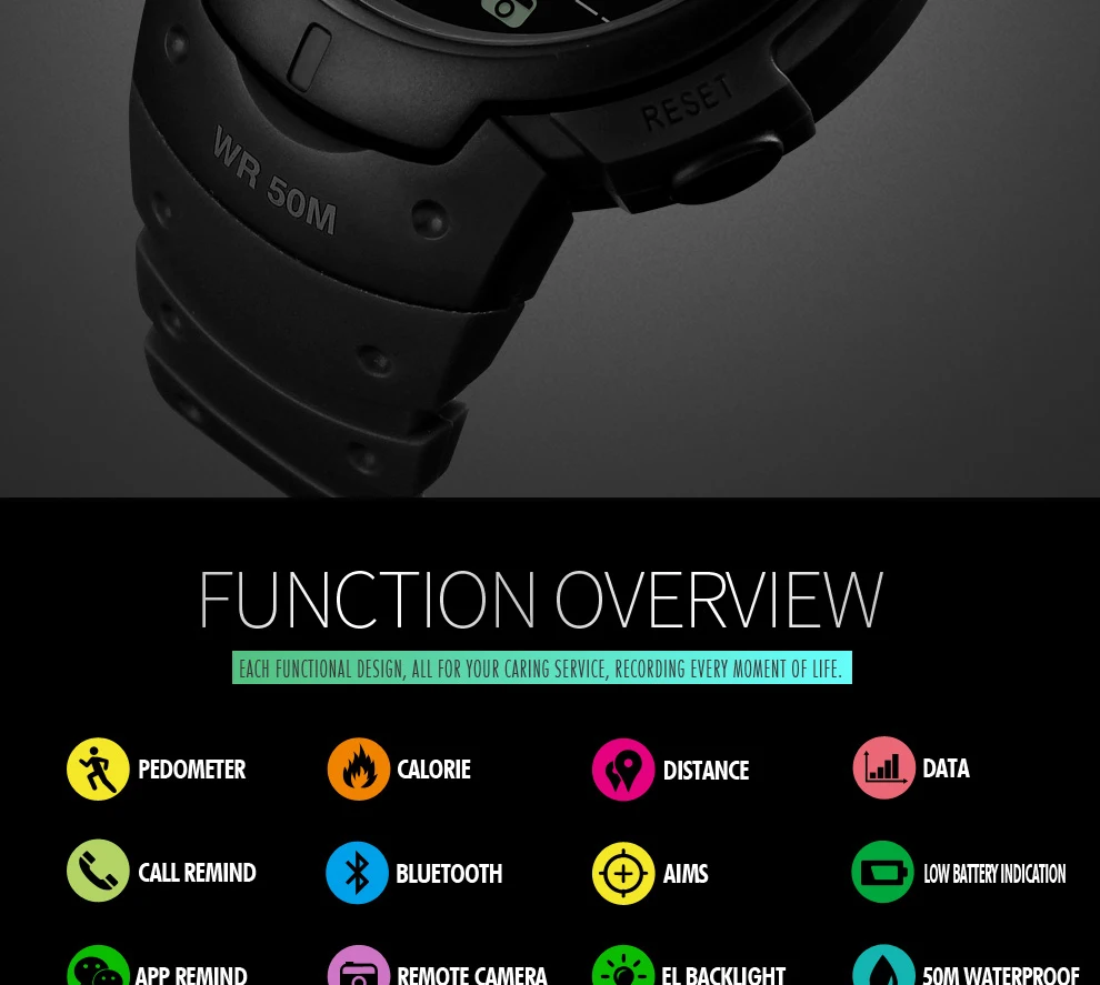 Features 1:Pedometer,Calorie,App Remind,Distance,Remote Camera