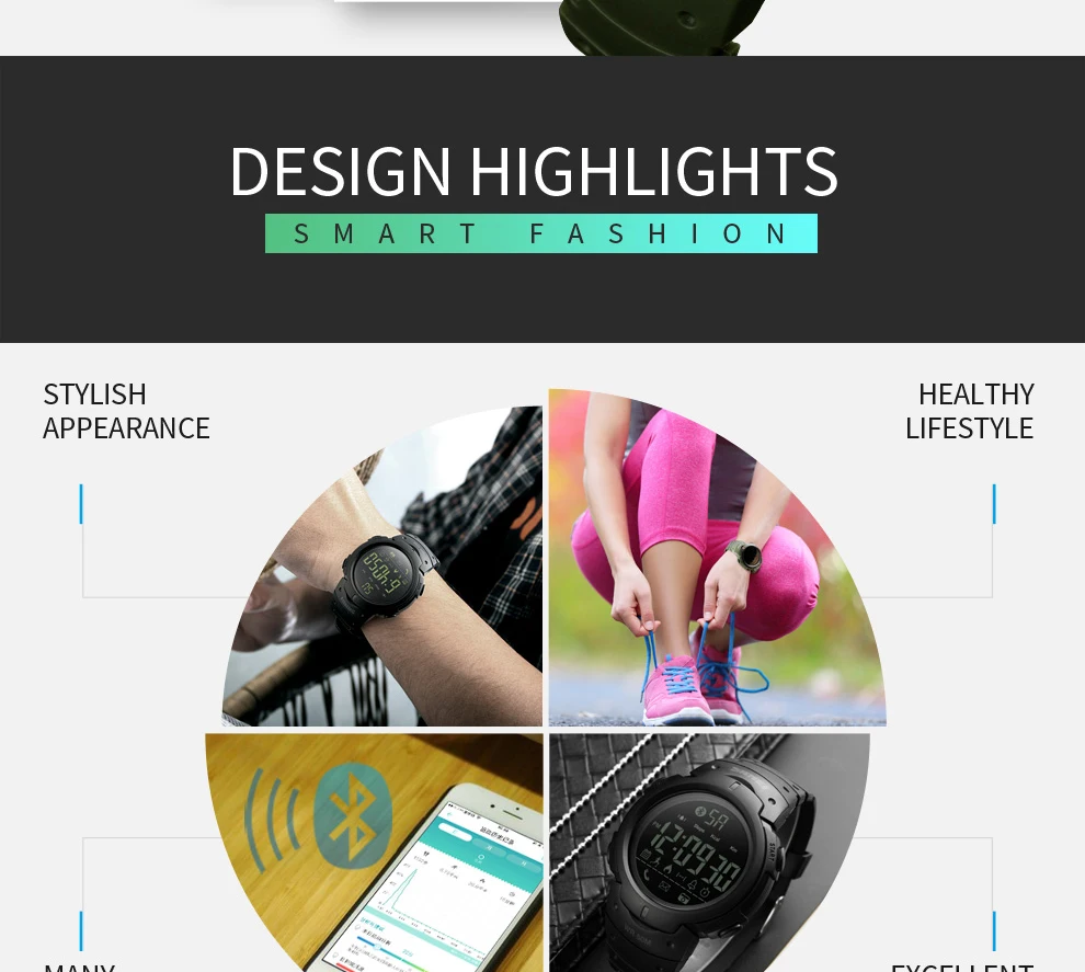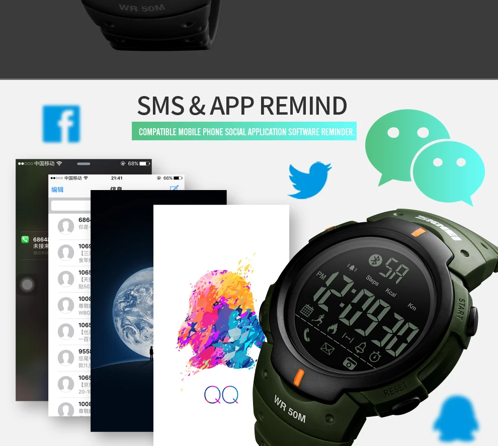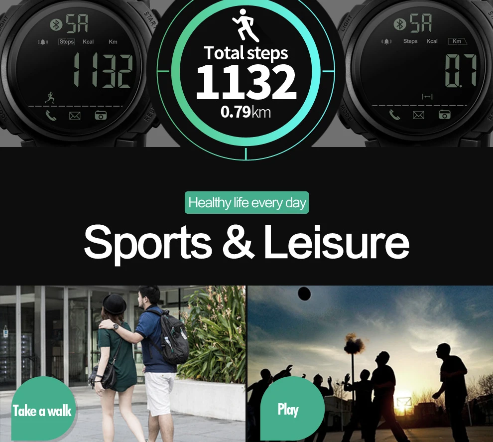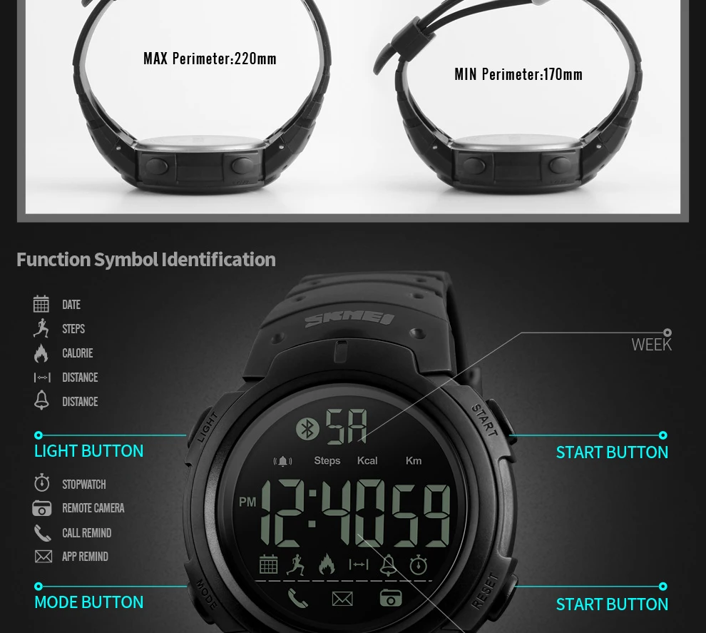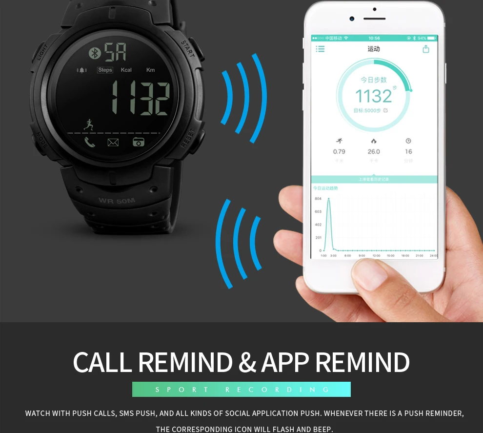 Feature:LED display,Auto Date,Message Reminder,Shock Resistant,Chronograph,Water Resistant,Back Light,Alarm,Bluetooth,Week Display