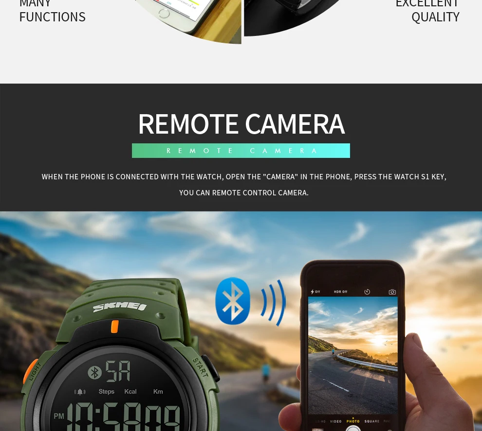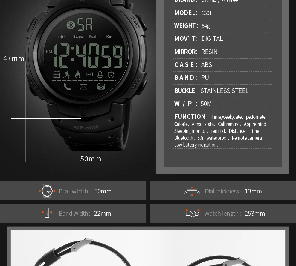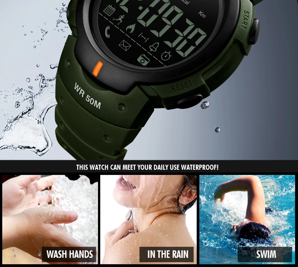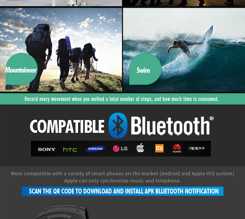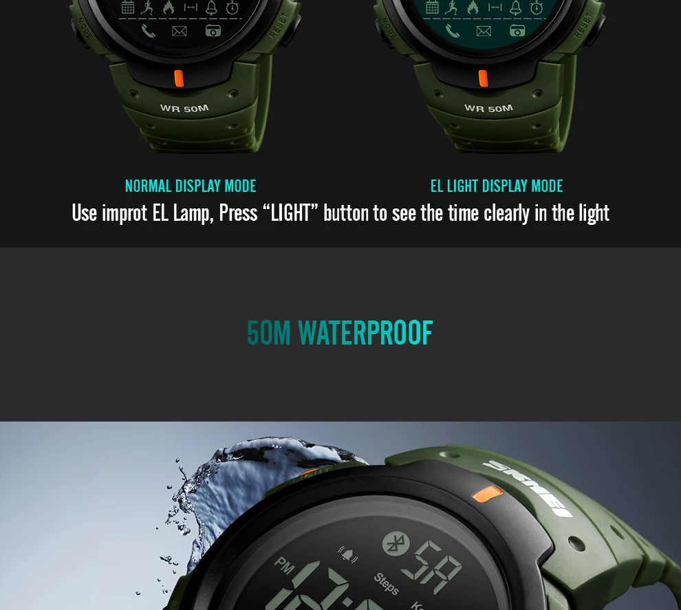 Feature:LED display,Auto Date,Message Reminder,Shock Resistant,Chronograph,Water Resistant,Back Light,Alarm,Bluetooth,Week Display