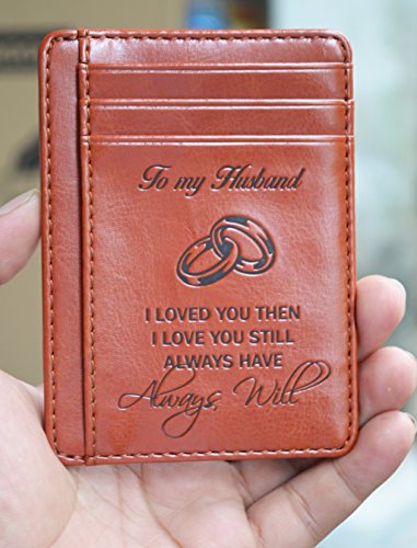 -. Feature : Premium Quality Pu Leather (Soft, Durable, and Breathable) Hand-Crafted by the Finest Workmanship gift idea features the words " To My Husband I loved you then, I love you still, always have, always will" / The best present for husbands: Makes a great birthday gift, valentines day gift, anniversary gift, fathers day gift / What a perfect keepsake to celebrate years of being awesome! This is a message for husband. Wife to husband gift. Love message for husband. Ready SURP.R.ISE / PREMIUM FUNCTIONALITY: Our RFID wallet not only offers security, it's also very functional. It features 6 card slots for you to place your most frequently used cards.