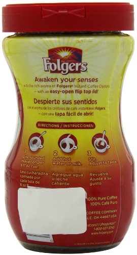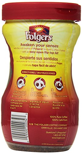 Wake up to a steaming hot cup of delicious Folgers Classic Roast Instant Coffee.This 100 percent pure coffee is made from rich, mountain-grown beans.Simply add hot water for an instant cup of coffee anytime you need one.The Folgers coffee package contains enough to make 120 cups of coffee. The smooth taste and rich aroma are sure to please coffee lovers.