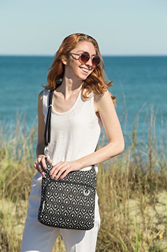 This bag is stylish as well as functional. It has a locking front organizer pocket, a zip wall pocket, and two open top pockets to keep you organized. It also has a rear slash pocket to keep your items readily available. The slash-resistant adjustable strap can be secured to a stationary object to prevent a grab and go. The locking main compartment has rfid blocking technology which prevents unauthorized access to your personal information.Feature