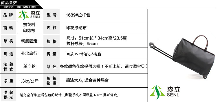 Trolley bag trolley case trolley bag men and B:women waterproof portable travel bag large capacity luggage bag Size: 51cm long * 34cm high 23.5 * thick (there will be a variety of different measurement error 1-3cm) Equivalent to about 20 inches Trolley Fabric: Canvas (each pattern of different materials are somewhat different, the quality is the same) Lining: Printed polyester lining Accessories: thick metal rod hardware accessories paint
