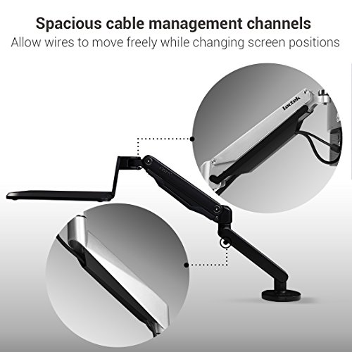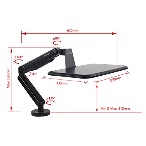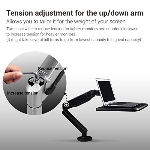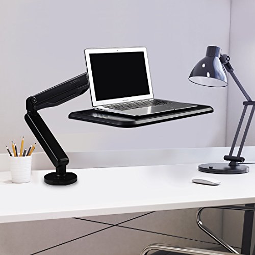 -. Feature : Gas spring counterbalance technology, allows user to switch work position from sitting to standing easily. / Generous work surface, perfect for 10"-17" laptops, from the MacBook Air to the MacBook Pro. Supports laptop weighing 2.2-15.4 lbs, Made of aircraft aluminum, providing long-lasting use. / Quick and easy installation, both gromment and clamp basement are available. / Can be used as a supplementary surface for writing or drawing with a graphics pen tablet / Arm easily adjust to support an ergonomically correct workstation; more comfortably, reducing neck, eye and back strain