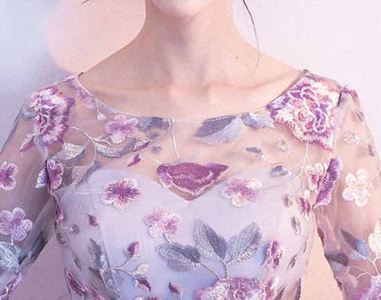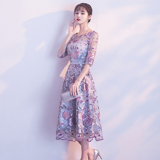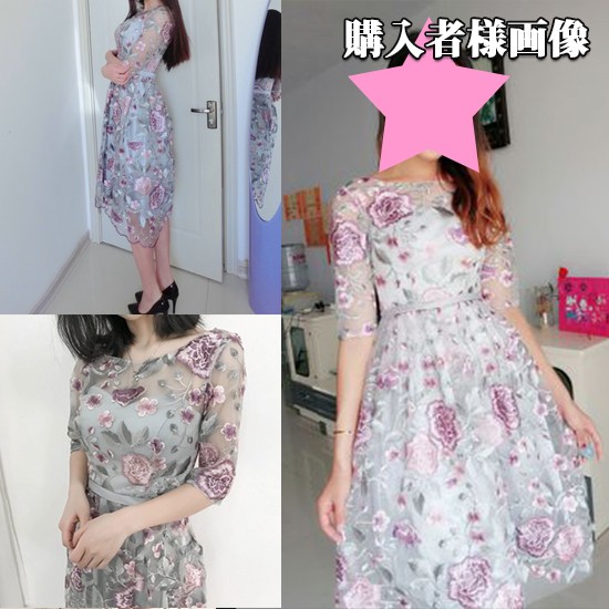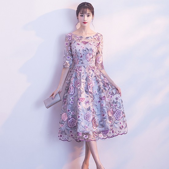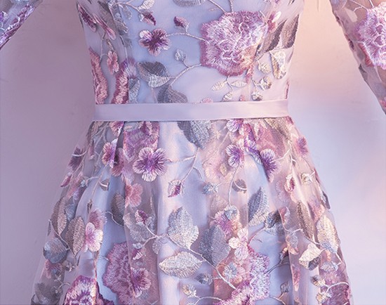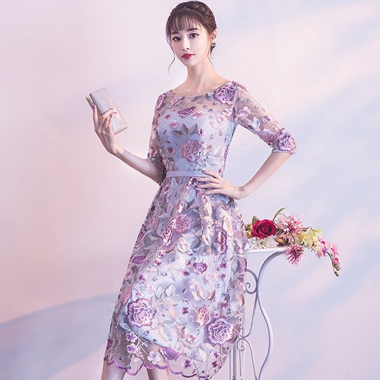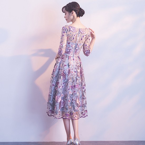 上品な花の刺繍のパーティードレス。