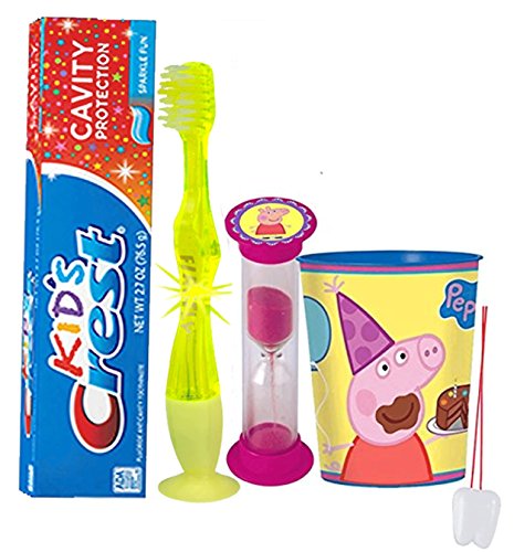 -. Feature : Turn something your kids have to do into something they want to do with the help Peppa Pig....Because when brushing is fun, it gets done! / (1) Firefly Youth Flashing Lights Suction Cup Toothbrush (Assorted Colors) (1) Kids Crest Cavity Protection Sparkle Fun Toothpaste, 2.7 oz / (1) Peppa Pig 16oz Plastic Mouthwash Rinse Cup, Doubles As Toothbrush Holder! / (1) Dentist Recommended 2 Minute Peppa Pig Themed Brushing Timer (Assorted Styles) / Plus Bonus "Remember to Brush" Visual Aid Tooth Saver Necklace. Hang it in their bathroom or by their bed so they remember to keep their chompers sparkly fresh. You could also use these tooth charms to save one of your child's baby teeth.