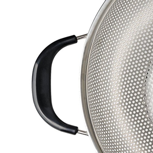 The perforated bowl is manufactured using best quality stainless steel. The quality of the material and smooth design of the large holes allow you to drain all the water efficiently from your food. Not a single drop will be stagnated between the walls and the bottom. The design is extremely strong and reliable. The handles and the brim of the KUKPO colander are made of soft rubber that is heat resistant. This feature allows you to strain pasta and noodles right off the boiling saucepan without any burns or trouble. The grip is optimized by the soft rubber handles.