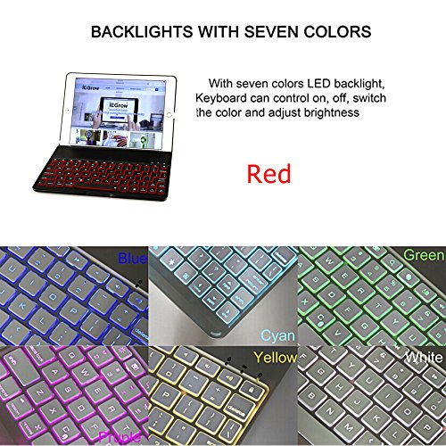 -. Feature : iPad Air2 Keyboard Case ONLY compatible with the 2014 release 9.7-inch iPad air 2, the model numbers are "A1566" and "A1567", will NOT fit for the First iPad Air or any other iPad or tablets! Please check with your tablet's model clearly before ordering! / 7 Colors Backlit Keyboard: 7 light color options , different brightness control, makes the air 2 keyboard works and looks great in dark / Slim, comfortable, waterproof iPad air 2 keyboard with optimized key design for comfortable typing experience / Shaft bracket design, allow the iPad air 2 to be tilted up to 135 degree to provide the most comfortable viewing position, change your iPad to small Macbook in seconds