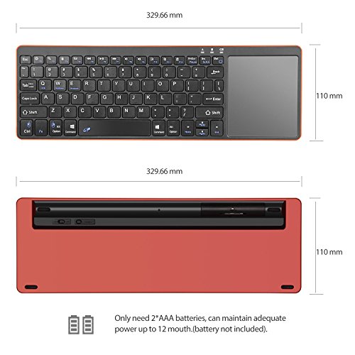 Specifications:Keyboard size: 329.6X110X17.8mm Touchpad size: 80.4X93.3mmWorking distance: 10MKeyboard layout: 80KeysSleep time: 10 minutes Awaken way: Any keysUse key the working current:<3mAWorking voltage: 3.0VLow voltage alarm:≤2.0VStandby current: 1.4mASleep current:0.009mAPower supply mode: AAA x2 dry batteryUse touchpad the wordking current: <19mA