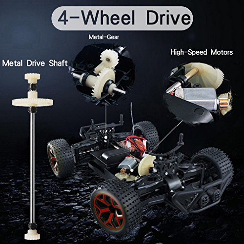 Specifications: Color: Red Size: 1 : 18 Scale,11.7 x 5.4 x 4.1 inches Radio system: 2.4Ghz, strong anti-jamming capability,several cars can be played at the same time Speed: 20km/h,very fast,gives you more fun when playing Controlling Distance: About 60 meters Charging Time:about 2-3 hours Using Time:about 20 minutes Battery for Controller: 2 x 1.5V AA Batteries(Not Included) Full Proportional 4WD rc truck is ready to run right out of the box