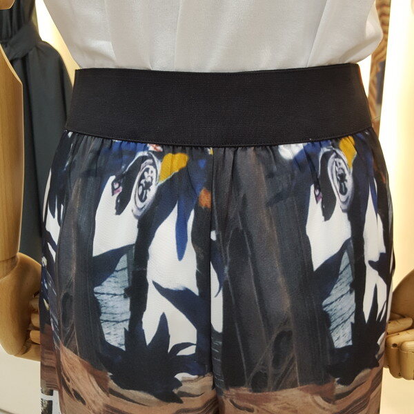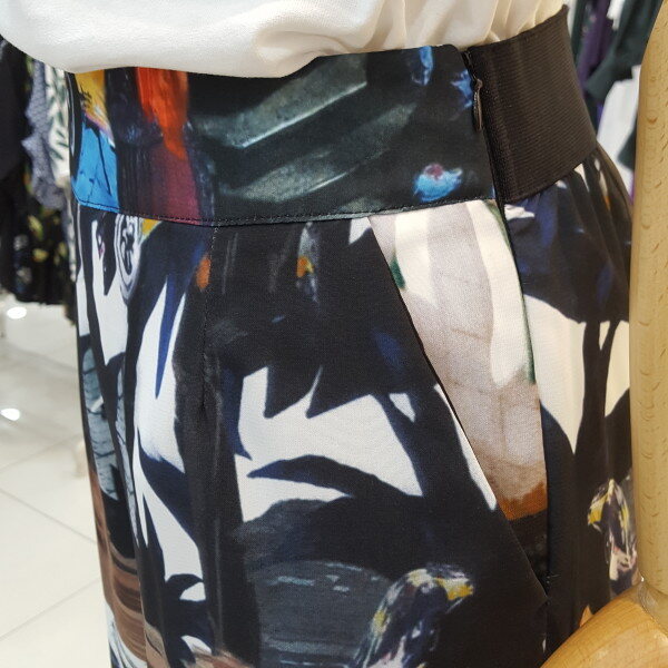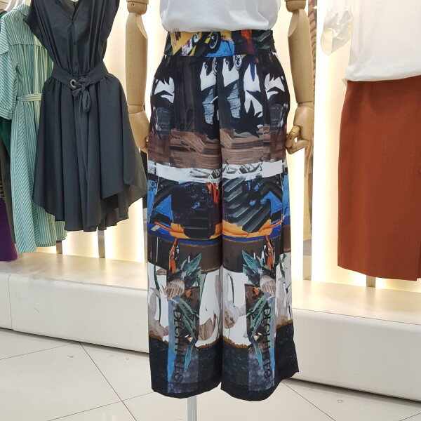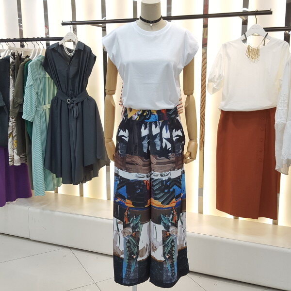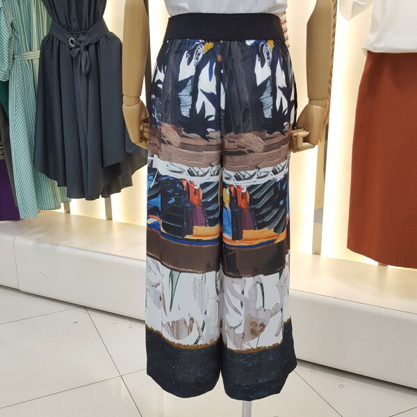허리 뒷부분 밴드형의 와이드팬츠입니다.유니크한 프린트로 독특하고 세련된 느낌을 주는 패턴의 디자인입니다.여러 아이템과 매치하여 트랜디하게 연출해보세요.