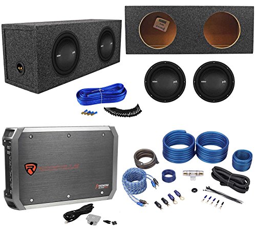 -. Feature : Package Includes : (2) Polk Audio MM1042DVC 10" 2400 Watt Dual 4-Ohm Car or Marine Subwoofers + Rockville RXD-M2 750 Watt RMS - CEA Compliant Mono Class D 1 Ohm Car Stereo Amplifier + Rockville RWK41 4 Gauge 2 Channel Complete Wire Kit With RCA Cables + Rockville RD10 Dual 10" 1.0 cu. ft. Sealed Subwoofer Enclosure With Grade A 3/4" MDF + Dual Enclosure Wire Kit With 14 Gauge Speaker Wire + Screws + Spade Terminals / Polk Audio MM1042DVC 10" 1200 Watt Dual 4-Ohm Car/Marine Audio Subwoofer Sub . Driver Compliment: 10" (254mm). Cutout Dimensions: 9" (230mm). Mounting Height: 0.55" (14.06mm). Mounting Depth (Top): 4.6" (115mm). Mounting Depth (Bottom): 5" (129mm). Peak Power Handling: 1200 Watts. Continuous Power Handling: 400 Watts RMS. Nominal Impedance: 4 Ohms. Frequency Response: 28Hz-200kHz. / Rockville RXD-M2 3000 Watt/1500w RMS Mono Class D 1 Ohm Car Stereo Amplifier With Optical Coupler Technology. CEA Compliant Power Ratings . 1 Ohm: 750 Watts x 1 Channel <1% THD+N . 2 Ohm: 550 Watts x 1 Channel <1% THD+N. 4 Ohm: 400 Watts x 1 Channel <1% THD+N) . RMS Power Ratings:. 1 Ohm: 1500 Watts x 1 Channel. 2 Ohm: 1100 Watts x 1 Channel. 4 Ohm: 800 Watts x 1 Channel. / 1 - 17' High Grade Twisted Pair of 100% Copper RCA Cable. 17' - 4 Gauge Translucent Blue SuperFlex Power Cables. 17' - 18 Gauge Blue Remote Cable. 17' - 16 Gauge Clear Speaker Wire. 3' - 4 Gauge Clear SuperFlex Ground Wire. Gold Plated AGU Heat Resistant Fuse Holder. 60 Amp AGU Gold Plated Fuse. 7' Split Tube Loom. Accessories Included: Wire Ties, Ring Terminals, Butt Connectors, Spades, and Grommets. / Rockville RD10 Dual 10" Sealed Subwoofer Enclosure. Proudly Made In The USA, Using Only The Finest Quality Materials - For The Best Level of Performance From Your Subs!. 3/4" USA Heavy Duty MDF Construction. Machine precision cut mounting holes . Top of the line Glue for extra durable adhesion. High quality GOLD spring loaded terminals. Designed, tested, and engineered to work with most of today's popular woofers.
