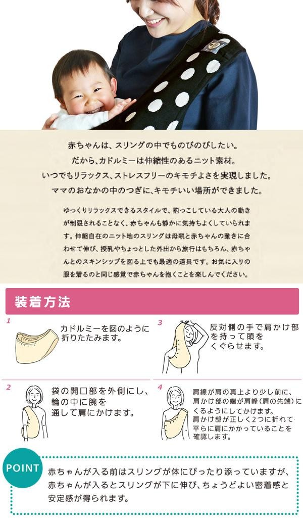 赤ちゃんが一番安心するのは、お母さんのお腹の中にいたときと同じ状態で抱っこされるとき。ニットの特性の「伸びる」「復元する」という性質は、赤ちゃんに適度なフィット感をもたらし、着脱もしやすいのが特徴です。家事やデスクワークのときも、ストレスを感じないで、赤ちゃんといつも一緒に過ごせます。 |