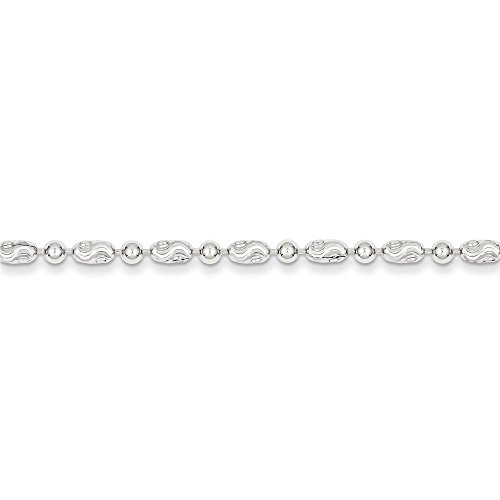 Round polished balls and textured oval beads gleam along the length of this sterling silver chain anklet that measures 3mm in width by 10 inches in length. It features a lightweight hollow link design and closes with a fancy lobster clasp. Made in ItalyFeature