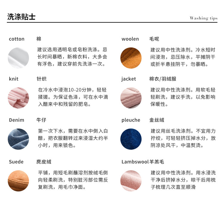 建议手洗;不可烘干;忌暴晒,在阴凉处悬挂晾干;熨斗底板温度不超过110 ℃