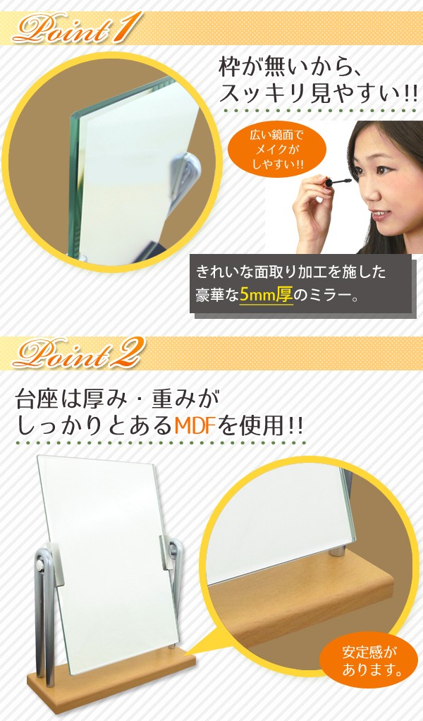 | <h1>台座にMDFを使ったスタンドミラー。面取りがきれいで、豪華な5mm厚ミラーを使用。360度角度調節が可能なので、しっかりメイクを楽しみたい方に♪</h1> |
