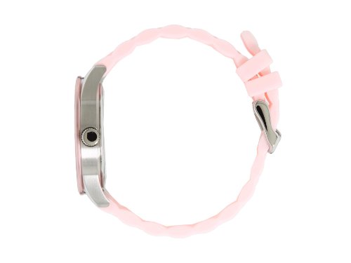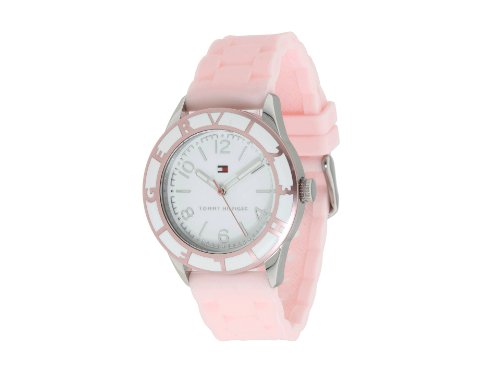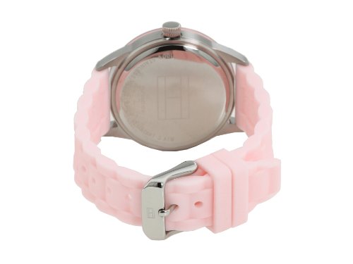 Stainless steel case with a pink silicone strap. Fixed white ion-plated bezel. White dial with luminous hands and alternating Arabic numeral and index hour markers. Minute markers around the outer rim. Dial Type: Analog. Luminescent hands and markers. Quartz movement. Scratch resistant mineral crystal. Pull / push crown. Solid case back. Case diameter: 38 mm. Case thickness: 10 mm. Round case shape. Band width: 20 mm. Band length: 8.5 inches. Tang clasp. Water resistant at 30 meters / 100 feet. Functions: hour, minute, second. Casual watch style. Tommy Hilfiger Sport White Dial Pink Silicone Ladies Watch 1781185.