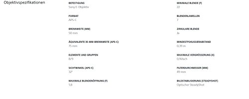 Lieferumfang: Sony SEL50F18B, Portrat-Objektiv schwarz, Sonnenblende (ALC-SH116), Objektivschutzkappe, Bajonettschutzkappe