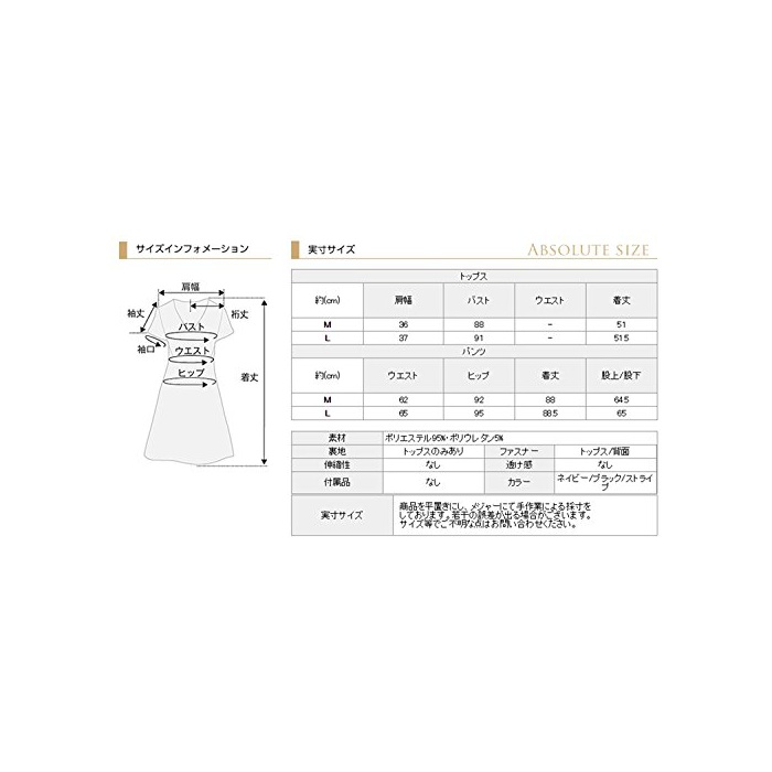 【사이즈】M/L 【신축성】약간 있음(팬츠 만) 【패스너】있음(톱스 배면) 【부속품】없음