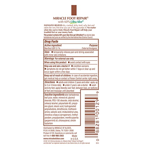 Studio : Miracle of Aloe Publisher : Miracle of Aloe Binding : Health and Beauty Product Description Say Goodbye to Dry, Cracked, Itchy Feet! Miracle Foot Repair Cream from Miracle of Aloe is formulated with 60% pure UltraAloe to end dry, cracked, itchy feet forever! This incredible healing cream has helped millions restore their troubled feet. If your feet are dry and cracked...if the itching drives you crazy...if you pick at them 'til they're raw...if you have embarrassing foot odor, then you should know about this wonderful product that will give you immediate relief and may cure your troubled feet forever! What's the secret? We start with all natural, organically grown aloe vera leaves and process it using our unique UltraAloe method that produces a superior, more powerful gel rich in moisturizing and healing nutrients. The gel of the Aloe Vera plant which has been used for 4,000 years to help cure foot problems. It's a gentle, fast-acting natural skin moisturizer and curative that penetrates deep below the skin's surface to get at the cause of the problem to rehydrate and restore skin. Then Miracle Foot Repair is specially blended with powerful moisturizing and skin restorative agents. Don't wait - get the relief you need. Users say it feels so good and works so fast even doctors can't believe it! If you suffer from any of these foot problems, you should try it as soon as you can. You'll see results practically overnight. 100% Guaranteed. Available in 1 oz, 4 oz, 8 oz and 32 oz containers. 0
