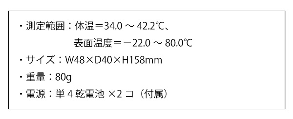 ●測定範囲:体温=34.0~42.2℃、表面温度=-22.0~80.0℃