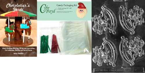 Cybrtrayd Santa on Rocking Horse Chocolate Mold with Chocolatier's Bundle of 50 Cello Bags, 25 Green and 25 Red Twist Ties and Chocolatier's Guide